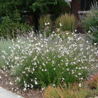 -Whirling Butterflies- The plants about 12" tall and the flower spikes grow up about 24"-30". Does look like butterflies flying all over above it. White flowers or pink.