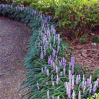 -Variegated Liriope is another favorite border plant. It does great in a semi-shady location, and it also produces purple flower spikes. In the center picture the plants are spaced out more than the plants in the picture on the right. Spacing is up to you.